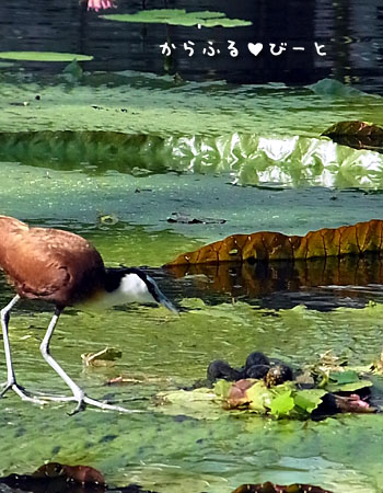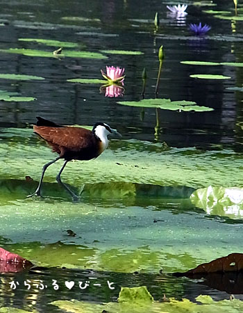 大きなオオオニバスの上を歩く鳥を発見!!