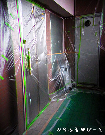 ベランダの塗装もようやく完了し現在は玄関回りや階段を塗装中の我マンション。