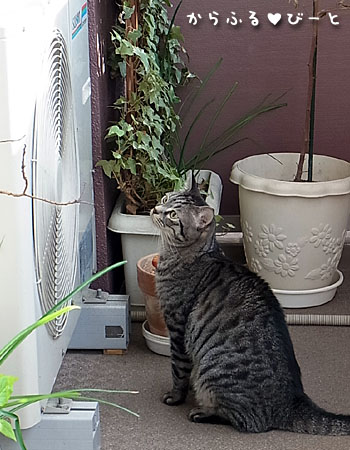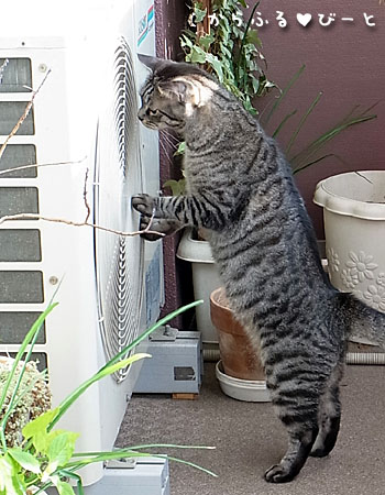 めっちゃ不思議そうにエアコンの室外機を覗き込むトラちゃん。