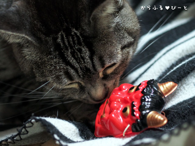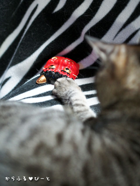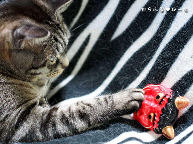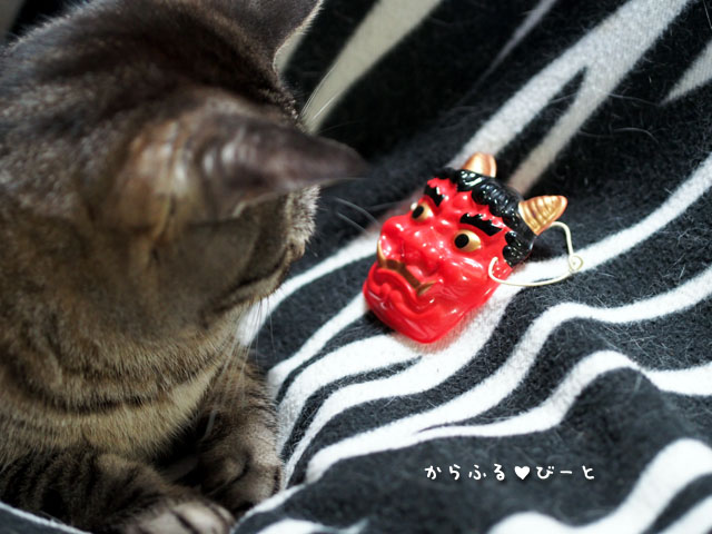 突然の鬼の出現にビビリながらも少しずつ興味を示し始めるトラ。(笑)