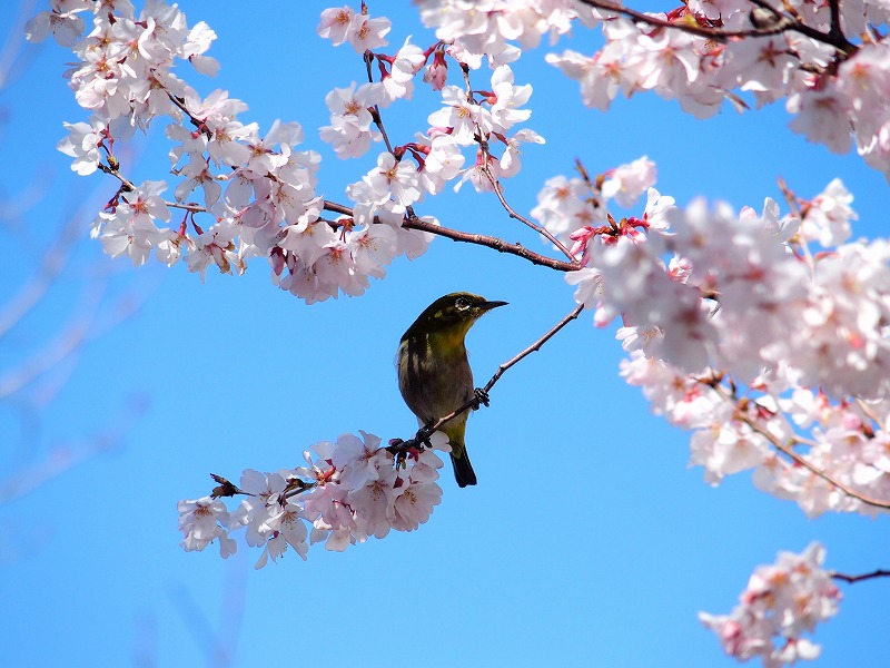 満開の桜の中を楽しそうに飛び交うメジロたち。